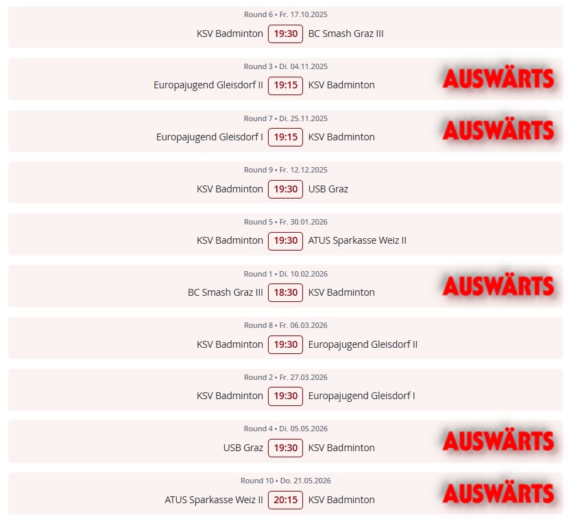 Ravne Open 2025 Beim diesjährigen Ravne Open in Slowenien waren wieder 6 Spieler vom KSV Badminton vertreten. Es konnten folgende Platzierungen erreicht werden: Herrendoppel A-Bewerb: 2. Platz: Markus Katzmayr / Haris Masovic Herrendoppel B-Bewerb: 3. Platz: Dieter Lehner / Louis Hohl 5.-8. Platz: Walter Rappold / Billie Ortanez ![]() Der KSV Badminton gratuliert herzlich und bedankt sich beim austragenden Verein Karizma. Information vom BC Karizma |